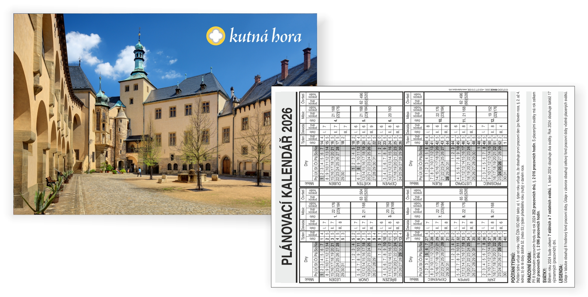 Vnitřní strana s kalendáriem - kontaktní údaje, prezentační texty